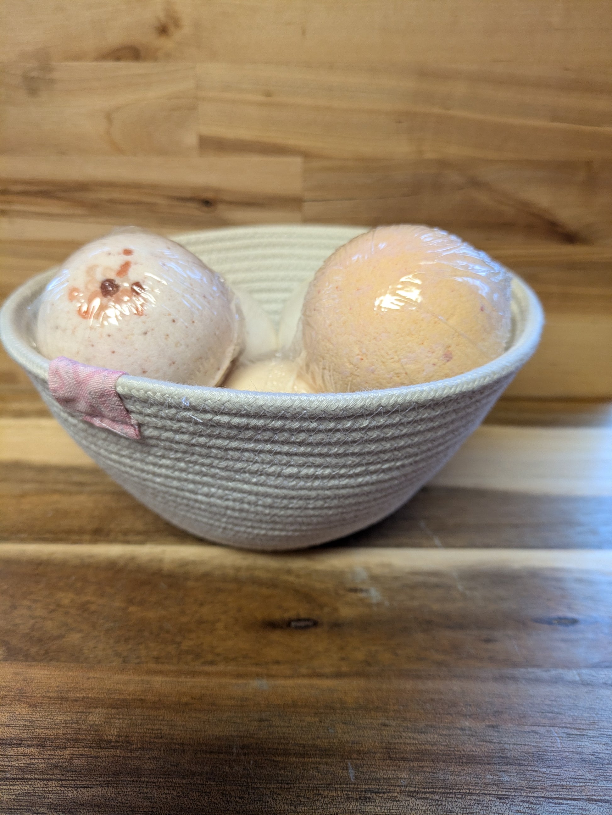 handcrafted basket of cotton with 5 bath bombs Cherry, Grapefruit Mango, Orange with Oats, Oceans, and Cactus Flower