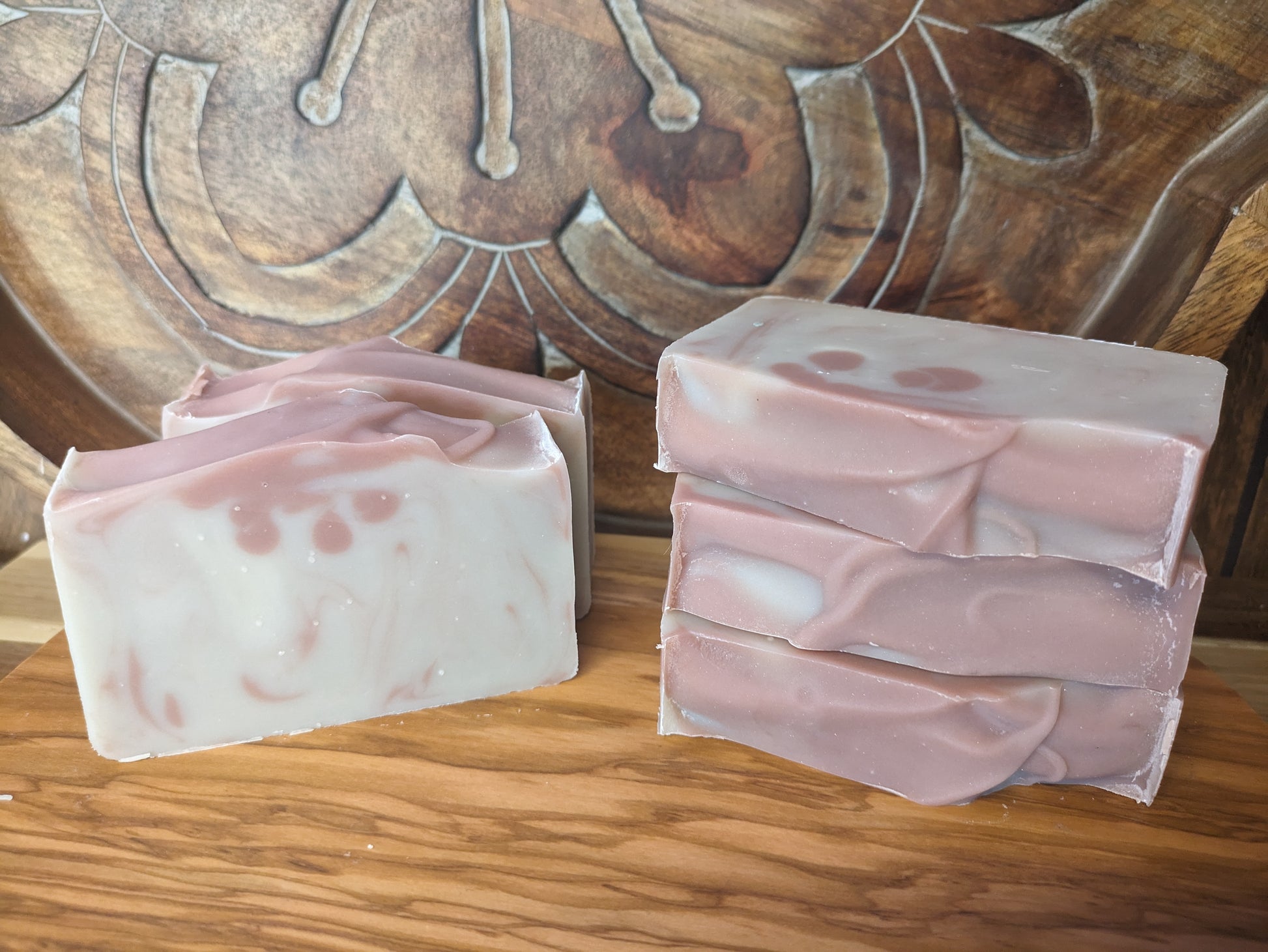 made with Olive Oil, Palm Oil, Distilled Water, Coconut Oil, Shea Butter Sodium Hydroxide, Castor Oil, Fragrance Oil, Kaolin Clay and mica colorants.